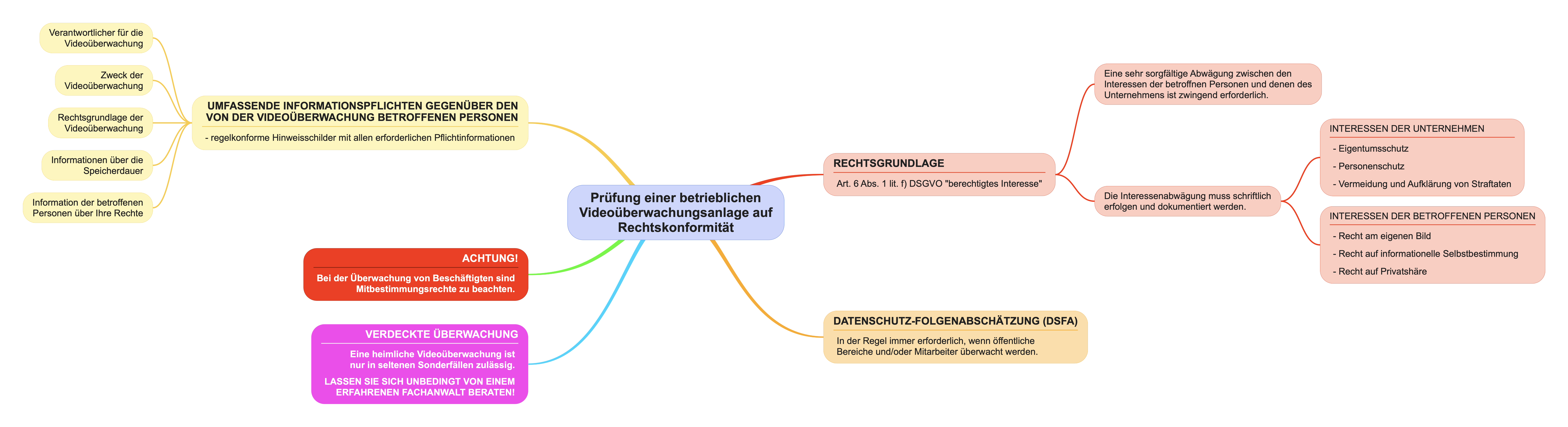 Wichtig: Die gesamte Interessenabwägung muss schriftlich erfolgen und dokumentiert werden. Sie dient als Nachweis, dass der Zweck der Überwachung (z. B. Schutz vor Einbruch) die Grundrechte der Betroffenen (z. B. Recht auf Privatsphäre) im konkreten Fall überwiegt.